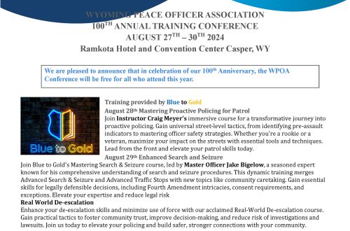 WPOA’s 100th annual membership and training conference is scheduled for Tuesday, August 27 through Friday, August 30, 24, at the Ramkota Hotel and Conference Center in Casper, Wyoming.